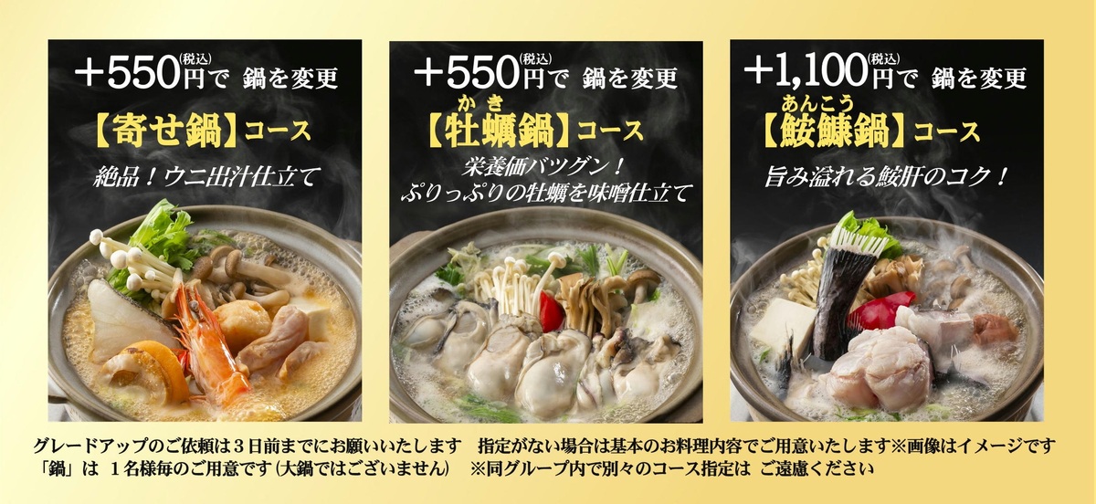 ➀【寄せ鍋コース】+550円 ➁【牡蠣鍋コース】+550円 ③【鮟鱇鍋コース】+1,100円